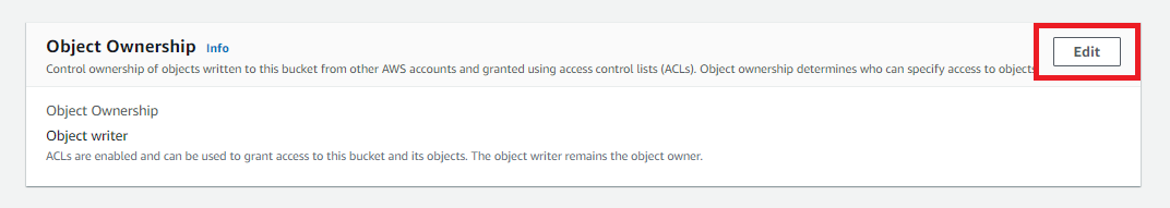• Step 3: Go to your newly created S3 Bucket click on Permissions -> Object Ownership and click Edit.