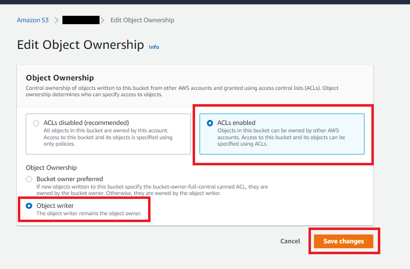 • Step 4: Select ACLs enabled and Object writer and click Save Changes.