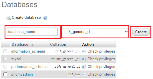 • Step 3: Provide database name and select utf8_general_ci as collation and click create button.