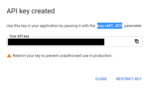• Step 7: The API key created dialog displays your newly created API key. Copy and paste it as shown in Step 8. The new API key is listed on the Credentials page under API keys.