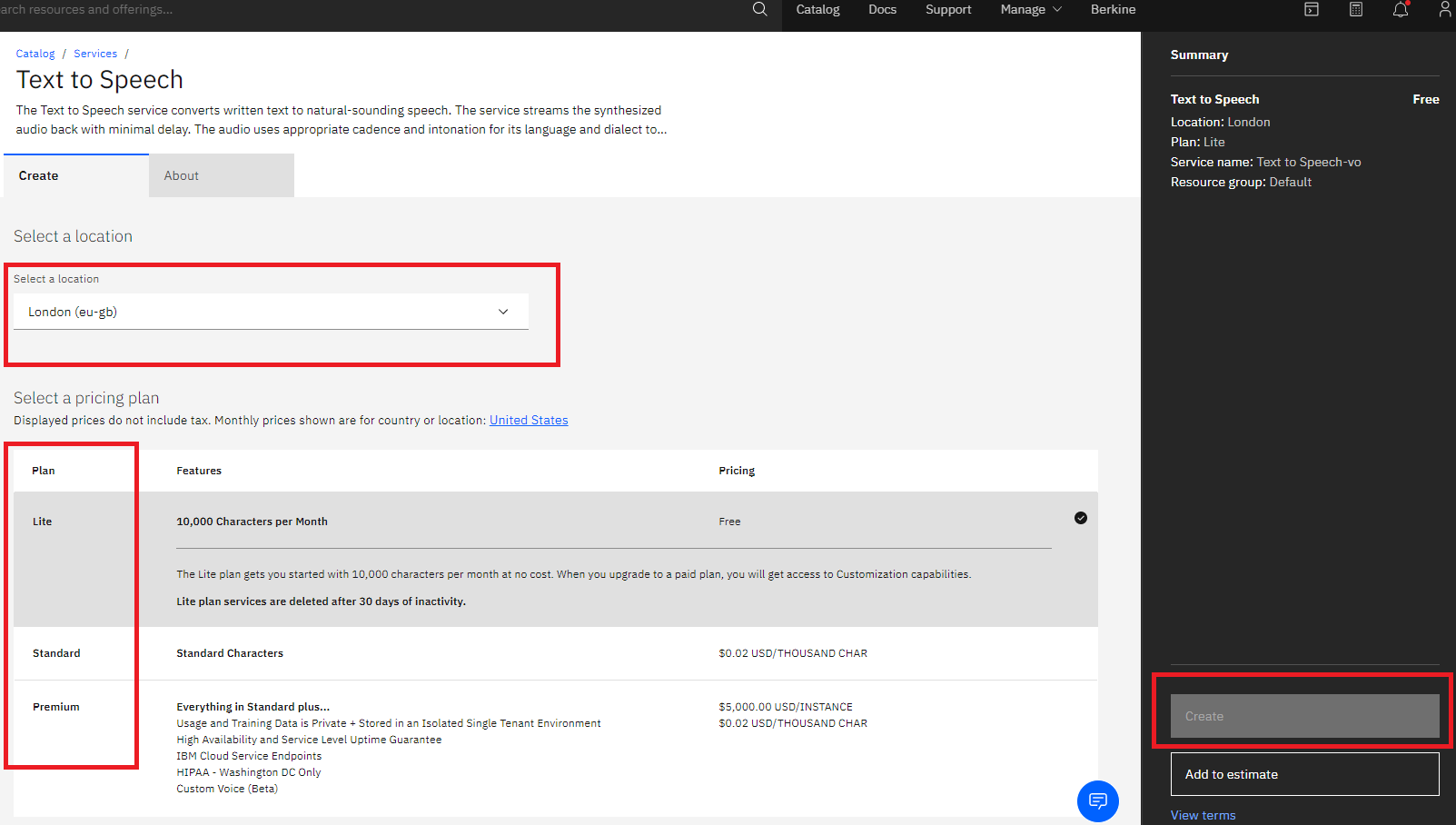 • Step 4: Select IBM region and your desired plan, also resource name and click Create button.