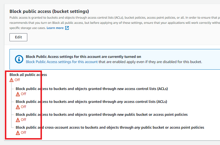 • Step 1: Make sure your Permissions -> Block Public Access looks at least like this and has all 4 options turned off.