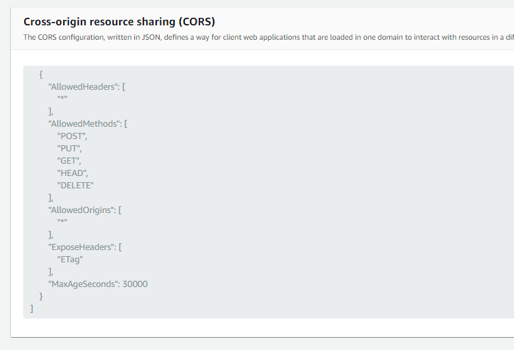 • Step 2: Add CORS settings as shown below in the Permissions -> Cross-origin resource sharing (CORS) Configuration section and click Save.