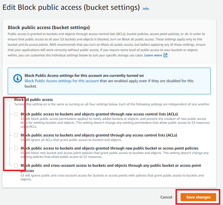 • Step 4: In the Set Permissions step, you need to turn off all 4 options if you want to make your S3 bucket completely public.